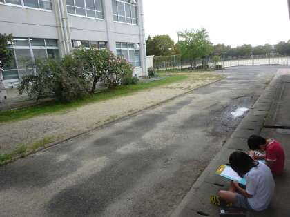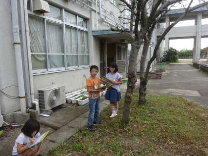 10月10日。総合的な学習の時間に竹の里自然探検隊の活動を行いました。春に決めた1人1本の木の変化を観察します。今日のめあては「秋のはじまりの様子を観察しよう。」です。「夏の終わりのときと比べて葉っぱの数が減っていたよ。」「僕が観察している木の葉っぱの数は増えていたよ。」「葉っぱの色も変わっていたね。」など,気付いたことを書いた観察メモをもとに教室で交流しました。次回は秋本番の頃に活動予定です。