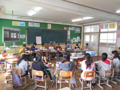 曜日によって給食の食べ方を変えている6年生。今日は金曜日なので,円になって食べる日でした。給食時間になるとさっと机を動かし,楽しくおいしく給食をいただいていました。もちろん食缶はすべてからっぽ!給食は子どもたちの元気の源です。
