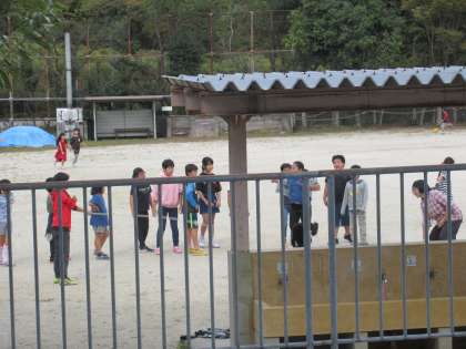 ランチルームから運動場を見ると,何やら楽しそうに遊んでいる先生と子どもたちを発見。