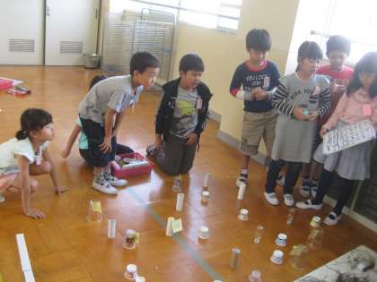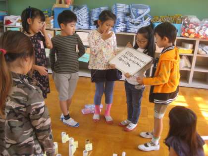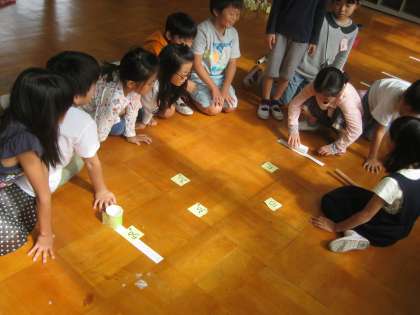 できた遊びを,他のグループの人に来てもらってやってみました。試してみて,点数や置き方を変えたり,スタートやゴールを変更したり,工夫をしながら進めています。