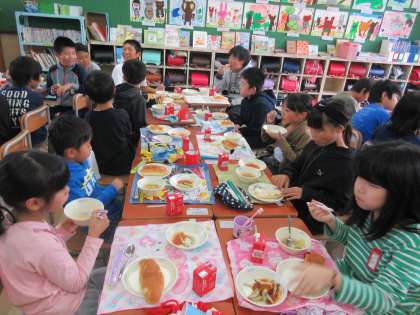 異学年で構成された「たてわり班」で給食を食べました。
