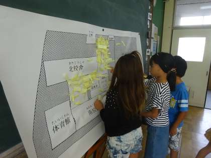 10月18日。理科の授業で調べた動物のすみかを,地図にまとめました。動物を見つけた場所にふせんを貼っていくと,竹の里小学校内で動物がたくさんいるところ,あまりいないところがはっきりと表れました。「池のところはたくさん動物がいるね。」「中庭にもたくさんいるよ。」「運動場の真ん中はあまりいないね。」など,完成した動物マップを見ながら話す子どもたちの姿がありました。