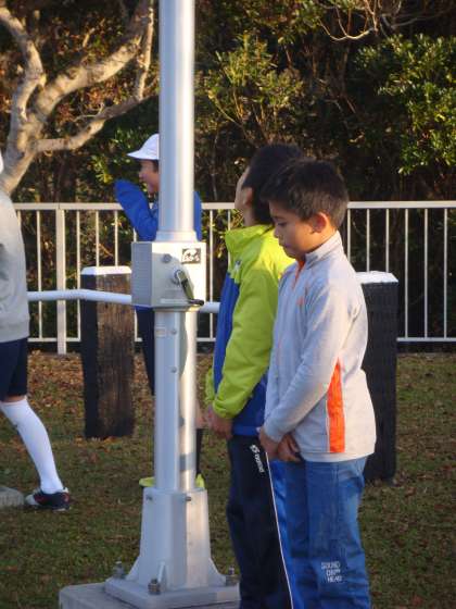 それぞれの学校の校歌を歌うながら,旗を掲揚します。