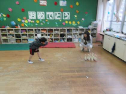倒れたピンを数えたり,自分の順番を待ったりするのも勉強です。
