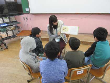 子どもたちは絵本が大好きなようで,すぐに教室前へ集まって集中して話を聞いています。