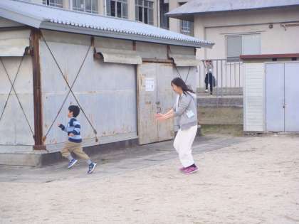 「にげろ〜!!」という声が聞こえてきそうでしょ。先生と遊んで,とっても楽しそうな子どもたちです。