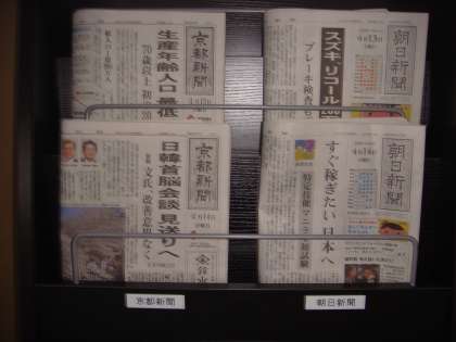 さらに,今年度は,高学年の子どもたちが,「リーディングタイム」(朝の読書タイム)【8:30〜8:40】で新聞を読むことができればと設置いたしました。京都新聞,朝日新聞,読売新聞,産経新聞と4紙を用意しました。