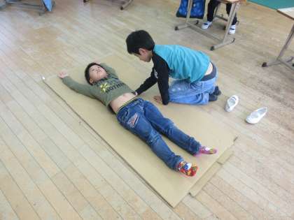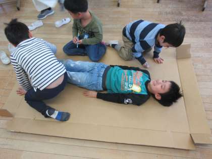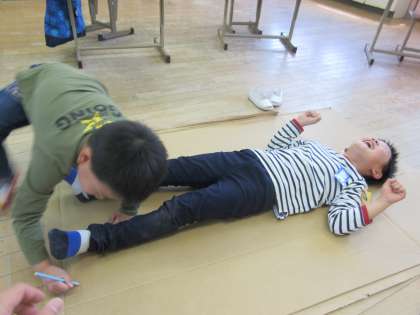初めはピンときていなかった子どもたちも,体を写し取る活動を見ていると「うわあ凄い!」「次は僕やる!」「あはは,くすぐったいよお」といった楽しそうな声がたくさん聞けました。