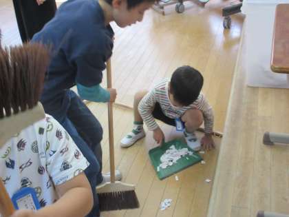 「僕が箒やる!」「じゃあ僕塵取りするよ。」「今日はごみ捨て誰が行くの?」