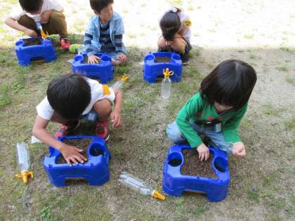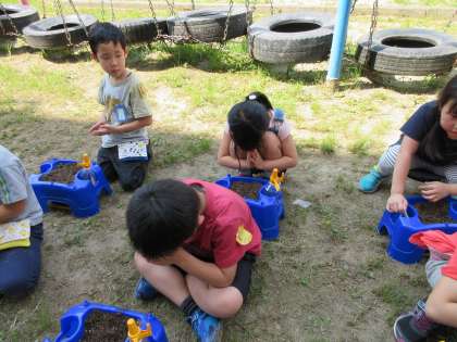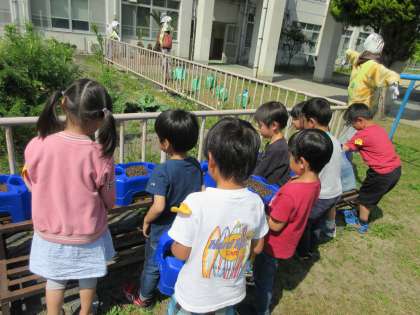 アサガオの種まきをしました。種をよく見ると,一つ一つ形が違います。そして,この小さなたねたちに土をかぶせた後,「きれいなアサガオの花がさきますように」「いっぱいお花をさかせてね。」など1人1人が願いをこめてお祈りをしました。アサガオには,1年生みんなの願いがきっと届いていることでしょう。
