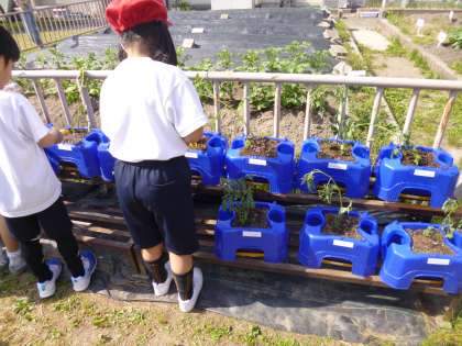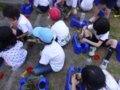 生活科の時間にミニトマトの苗を植えました。1年生の時はアサガオ,チュ—リップなどの花を育てる経験をした子どもたち。今年は野菜の栽培に挑戦です。美味しいミニトマトが実るよう,これから大事に育てていきます。