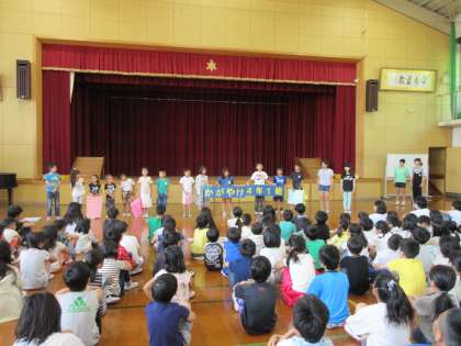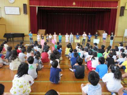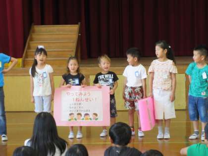 24日の児童朝会で,各学年の学年目標を伝えあいました。1年生の学年目標は「やってみよう 1ねんせい!」です。3つの目指す姿に向かってがんばっていることを,全校のみんなの前で発表しました。