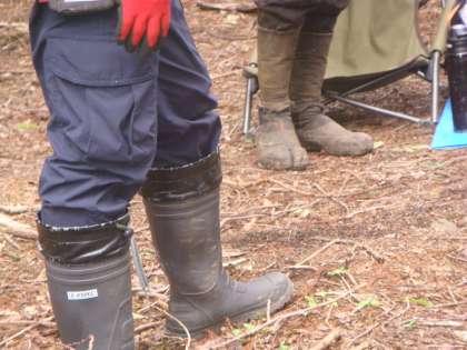 けがをしないように履いている靴は,なかに鉄板が入っていること。ズボンもチェーンソーでも切れないものだそうです。仕事をしてけがをすることがいちばんいけないことなので,しっかりと安全に気を付けられているということです。