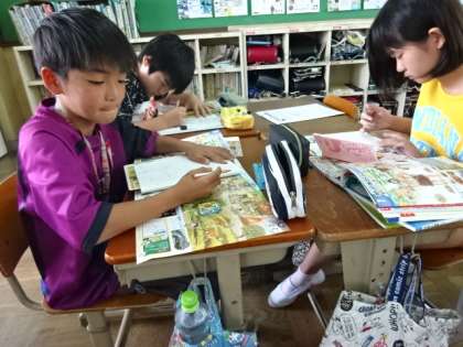 社会科での調べ学習。教科書を中心とした資料から調べる内容を読み,ノートに書き込んでいきます。書かれている内容や絵,グラフからその時代を読み取る中,