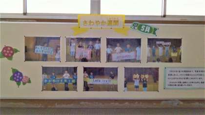 5月に行った児童朝会では,各クラスの学級目標を発表しました。その様子を写真でさわやか掲示板に掲示しています。ご来校の際はぜひお立ち寄りください。