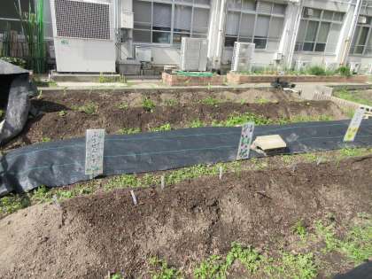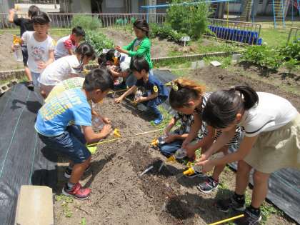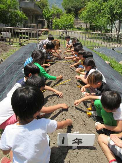 国語科の学習で「はなのみち」の学習しました。そして,学校園の1年の畑も花いっぱいにしようと,1年生みんなでいろいろな花の種をまきました。フウセンカズラ,コスモス,オジギソウ,ヒマワリ,ホウセンカ,色とりどりの花がいっぱい咲くように,これから育てていきます。