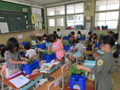 アサガオの本葉がたくさん出てきました。はっけんタイムでは「イヌの顔みたい。」「ヤギの顔にも見えるよ。」「きょうりゅうの足あとみたい。」「小さいはりみたいなものがいっぱいある!」「だから,さわると ちくちく ざらざら するんだね。」といろいろ見つけることができました。