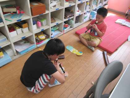教室後ろに行ってみると,まだ学習していないリコーダーを使って,歌に合わせて演奏していました。