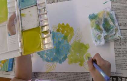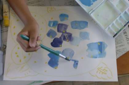 色混ぜで定番のアジサイですが,今回は,水彩画のように水でしゃばしゃばに溶いた絵具をにじませながら花びらを描く絵に挑戦しました。