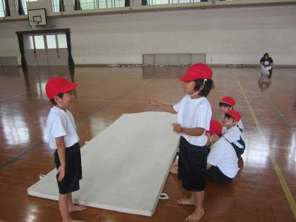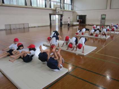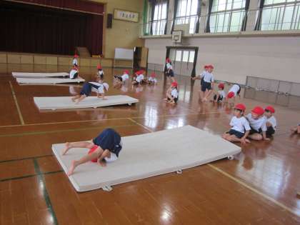 「うしろまわり」の練習をしました。ダンゴムシのように丸くなって回ります。お友達からのアドバイスをもらったり,自分でどんどん練習をしたりしてがんばっています。