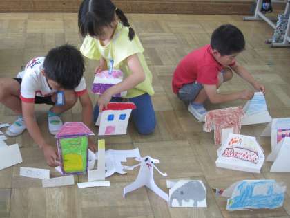 クラスのみんながつくったものを集めると,教室にすてきな『ゆめのまち』ができました。