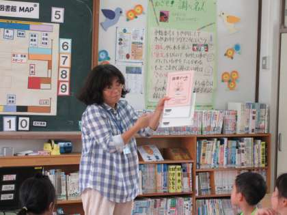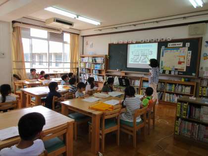 図書館指導で,本棚の分類のこと,本に貼ってあるラベルのお話を聞きました。