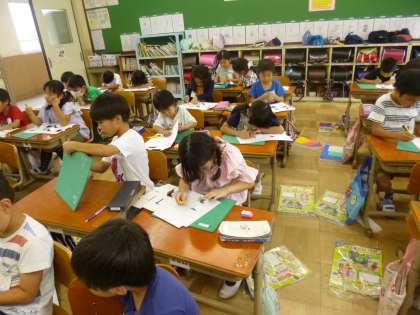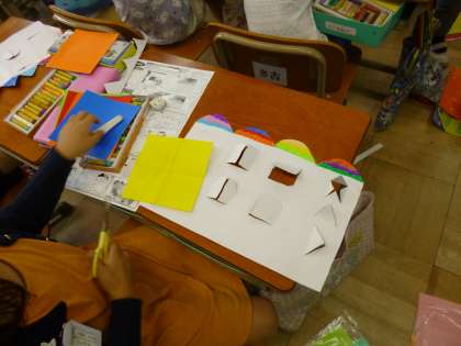 先週に引き続き,カッターナイフを使って工作をしました。今日は,自分で好きな形にまどを描いて,カッターナイフで切っていきました。全部の窓が開いたら,あとは思い思いに屋根を作り,窓から見えるものを考えてクレパスで描いていきます。みんな,楽しみながら工作に取り組んでいました。