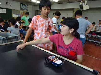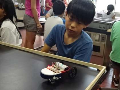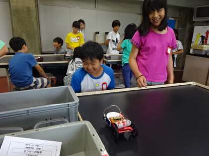 どのセンサーを使い,車体の前のどの部分につけるとよいかを考え,センサーカーを走らせていました。この実験は,子ども達に好評でとっても楽しそうでした。