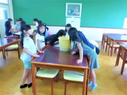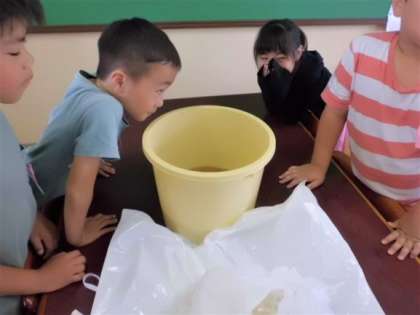 以前よりも,梅干し感が強くなっていたようで,「前は甘い香りがしたのに,今日は酸っぱい匂いがした。」「梅干しみたいにしわしわになってきた。」「赤い色が見えた!」など,今回もたくさんの気づきを得ることができていました。