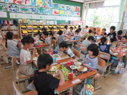 給食は,グループで机を合わせて食べています。給食はレストランで食べる時と同じように,食事中の約束があることを話すと,「ここは1年レストランや!」と声があがりました。