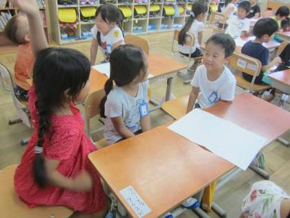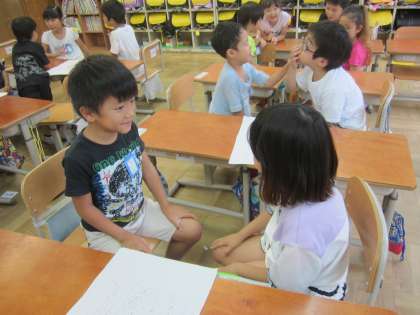 国語科で「すきなものなあに」のお話会をしました。友だちのすきなもののお話を聞いた後,質問や感想を言いました。