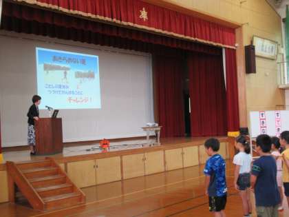 終業式では,学校長から1学期に頑張って取り組んだことについて振り返り,夏休みで続けて挑戦することの大切さについて子どもたちにお話ししました。