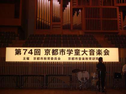 京都市の子どもたちが,集まって合唱や合奏を聞き合う音楽会です。これは,京都市音楽教育研究会が主催をしております。当日までに研究会の小学校教員が何度も集まり準備を進めてまいりました。当日の朝も最後の打ち合わせをして子どもたちを迎えます。