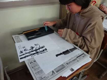 そして,手本を基に墨絵に挑戦!薄いところ,濃いところを考えながら絵に表しています。でき上がりが楽しみです!!