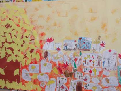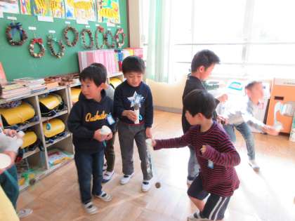 生活科のわくわくさんぽで見つけた秋の実でけん玉を作りました。マツボックリやドングリのけん玉で遊ぶと,教室の中は楽しさでいっぱいです。秋の大型絵本も出来上がりました。「みんなでつくろう あきのうた」にも,けん玉遊びのことをいれていきます。