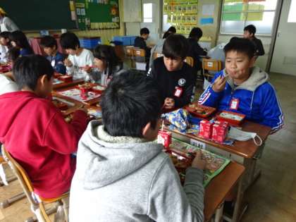 おかずとご飯の蓋を開け,ぱくぱくと食べ進めています。ご飯に食べ応えのある鶏肉やシャキシャキした野菜などを頬張っていました。給食の動画を観ながら栄養面なども学習していたようです。