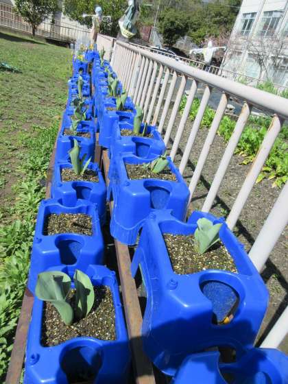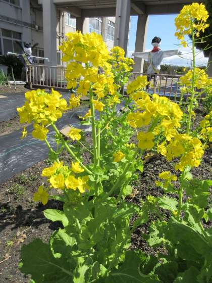 中庭は日毎に春めいて,黄色い菜の花が明るくまぶしいです。植木鉢のチューリップもぐんぐん背をのばして,花を咲かせる準備をしています。新学期には色とりどりの花で,みんなを迎えてくれることでしょう。どんな色の花が咲くのか楽しみにしていてくださいね。