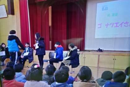 この日は,多文化交流会が行われました。6年生が代表でお迎えの言葉を言います。そして,ゲストティーチャーの方の紹介では,一言伝えて名札をかけました。