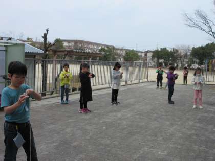 生活科の学習「ふゆとなかよし」でたこあげ,けん玉などのいろいろなお正月あそびをしました。こま回しをした時には,こま回し名人の中林先生に来ていただいて,回し方を教えていただきました。中林先生は,椅子の上でこまを回した後,手の上にのせる名人技を見せていただいて,1年生のみんなは目を丸くして見とれていました。中林先生のように回そうと,こま回しにこの後チャレンジしました。