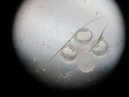 卵の外側には,毛みたいなものがいっぱいついています。卵の中は,あわのようなものが3〜4個見えます。あわのようなもののの反対側には少しふくらんだところが見えます。