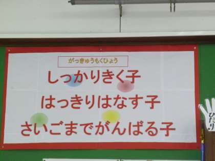 1年生の子どもたちに学校でこんなことをがんばってほしい,こんな1年生になってほしいという願いを込めて,学級目標を決めました。みんなで素敵な1年生になろうね!