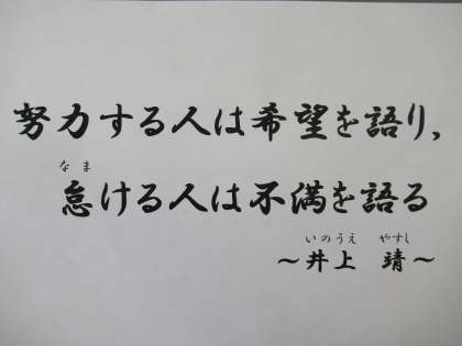 「愚痴(ぐち)や不満は,自分がなまけているからこそ生まれる。努力する人の目線はひたすら未来へあり,言葉は希望に満ちあふれている。」という意味のこもった井上靖さんの言葉です。井上靖さんは,文化功労者や文化勲章を受章した小説家です。昼間は新聞社で働き,夜に小説を書くという努力家ならではの言葉だと思います。