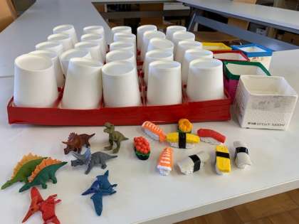 かみコップや きょうりゅう,おすしが みえますね。さて,どんな ゲームでしょう? さっそく,きょう,こうちょうせんせい,やまのせんせい,たかぎせんせい,ふじたせんせいの 4にんで ためしてみました。4にんぐらいで すると チャンピオンに なれない ひとは いない たのしい ゲームでした。