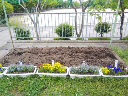 何をおいても大事なのは,土づくりだそうです。石灰(せっかい)をまいておいた土を今日はスコップでまぜまぜしました。どんな効果(こうか)があるのかは…調べてみましょう!