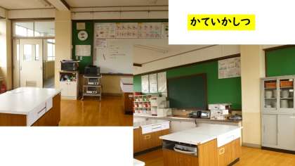 次は「かていかしつ」です。5年生になったら「かていか」という学習が始まります。家庭科室には,お料理の学習ができるように「まないた」や「なべ」,「おさら」などがおいてあります。