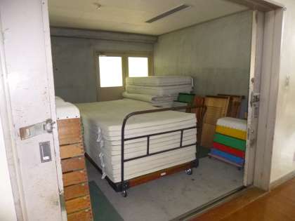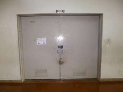 「たいいくかん」です。「たいいく」の学習で運動をしたり,全校で集まって集会をしたりするときに使います。「たいいくかん」には,いくつかの倉庫があって,その中に「とびばこ」や「まっと」などの運動に使うものが片付けてあります。