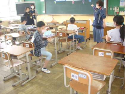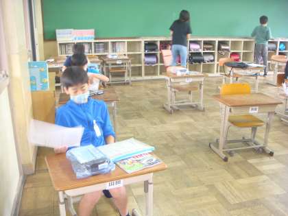 1年生の子どもは,真新しいランドセルを背負ってもう帰る準備です。「毎日学校に来れるのは,6月から?コロナが終わってからだね。」