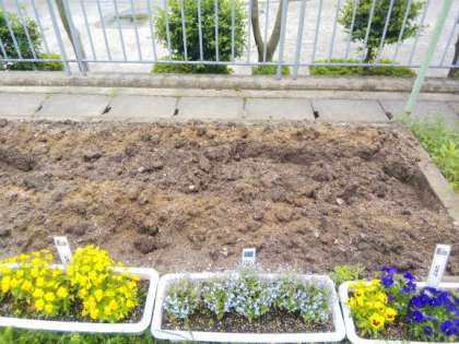 下の写真で土の色が少しちがうことろがあるの,分かりますか?肥料は去年,ヒマワリとホウセンカを植えた時にもあげましたね。なぜ肥料をあげるのだったか,覚えている人はいますか?