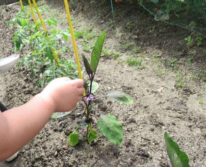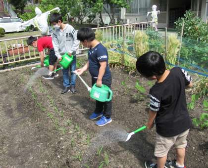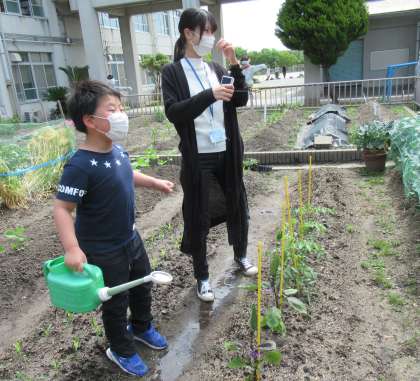 読み聞かせの後は,学級園の水やりをしました。じょうろを使い,たくさんお水をあげていました。なすの小さな実を見つけ,「なすがなってる!」と嬉しそうにしている子もいました。