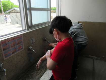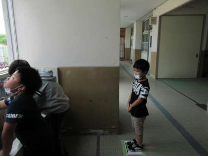 登校したときや水やりの後など,教室に入る前には必ず,みんなで手洗いうがいをしました。蛇口に並ぶときやランニング前の体操でも,ソーシャルディスタンスを確保するよう心がけることができました。